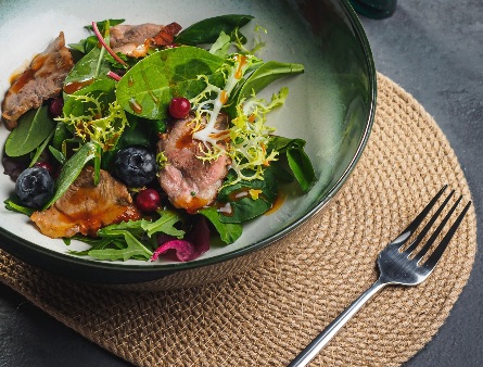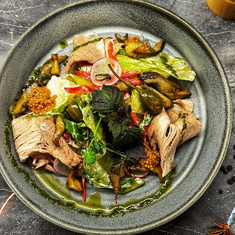 на подушке из микса салата с маринованными огурцами, стручковой фасолью, сладким болгарским перцем под бальзамической карамелью и соусом песто